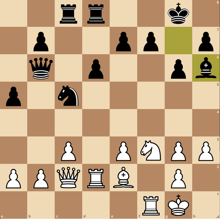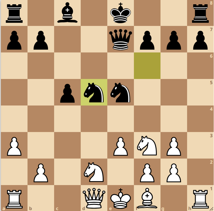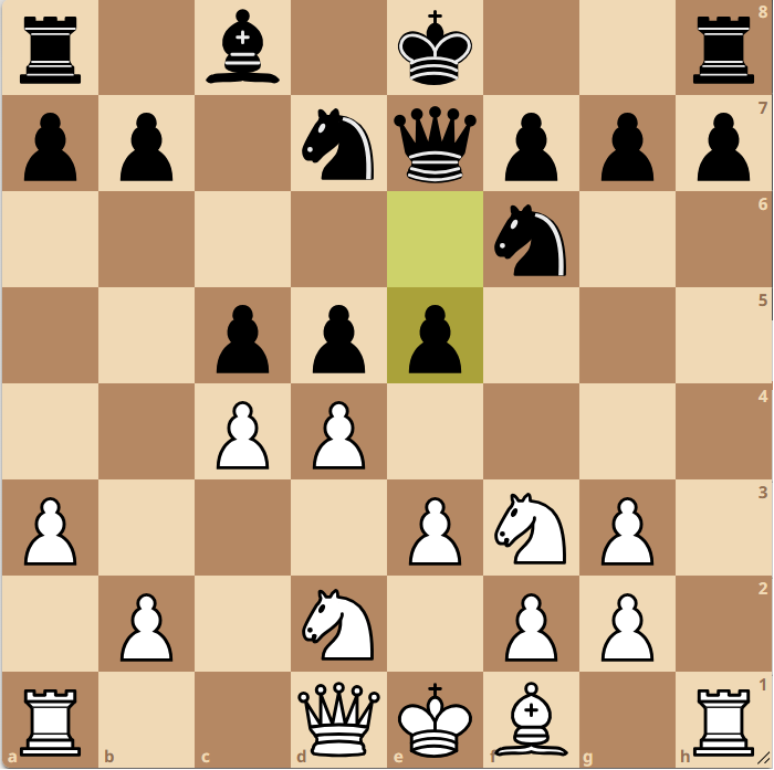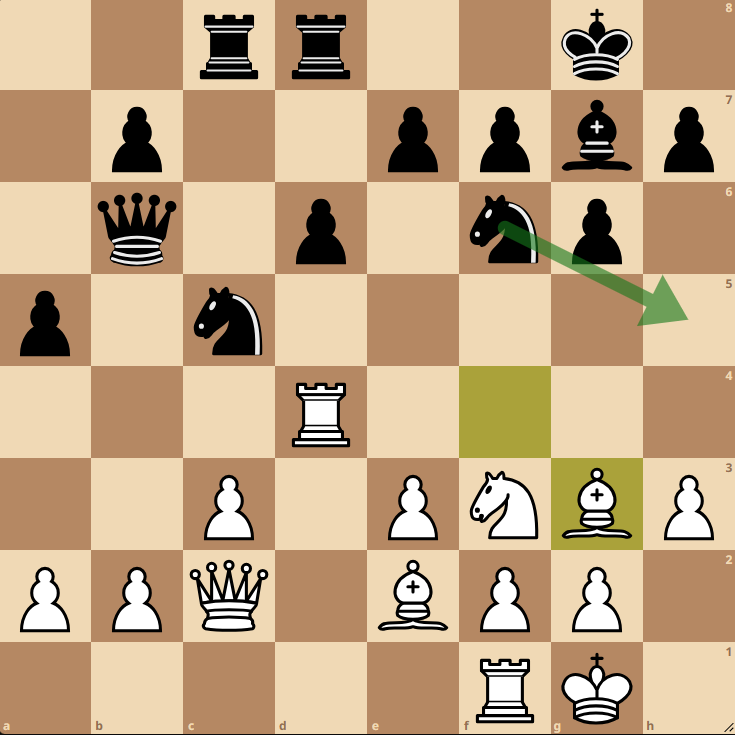 Daniel spielte die Sequenz fehlerfrei weiter: Erst tauschte er die Springer auf e5 ab, ehe er das schöne Sc4! zog. Die schwarze Dame wich nach e6 zurück, woraufhin Daniel, das gesamte Brett nutzend, den Turm über h5!! in den Angriff einschaltete. Engelke probierte noch f5 zwischenzuschieben, doch den Bauern konnte Daniel bedenkenlos nehmen, da ein mögliches Dxf5 in die Gabel Sd6 reingelaufen wäre. Ein sehr sehenswerter Erfolg für Daniel.