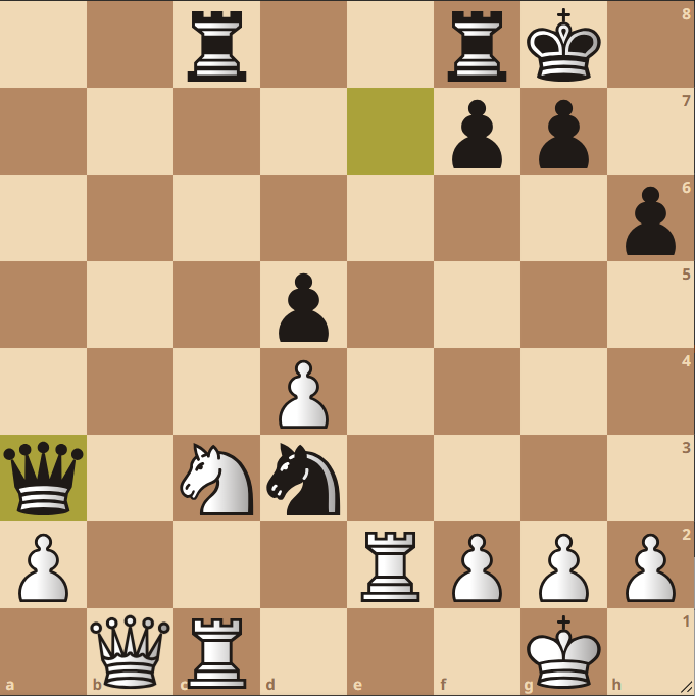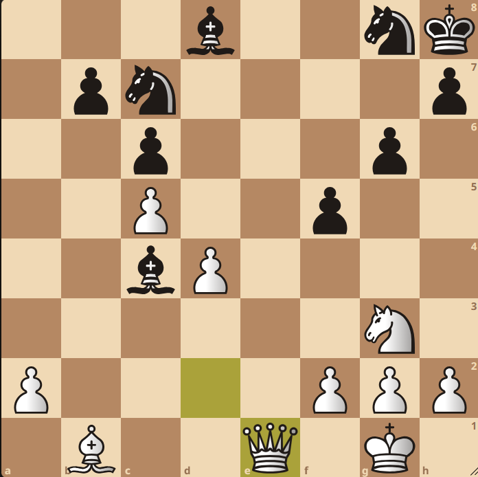 K.P. warf nun alles in die Waagschale, ließ sich auf einen Boa constrictor Partieverlauf (vom Gegner langsam erwürgt zu werden) nicht ein und entschied sich für das absolut materielle und offensive Ungleichgewicht (ein echter Kaponiero!). Er tauschte seine Dame gegen zwei Leichtfiguren, „wild“ trifft es demnach auch hier ziemlich gut. Gereicht hat es am Ende trotzdem nicht.