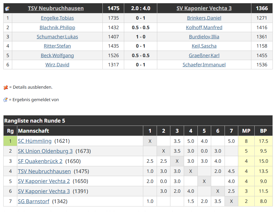 Da, wie bereits geschrieben, auch Immanuel seine Partie gewinnen konnte, Manfred und Karl jeweils einen halben Punkt holten, war Illias Niederlage am dritten Brett lediglich ein kleiner Schönheitsfehler.