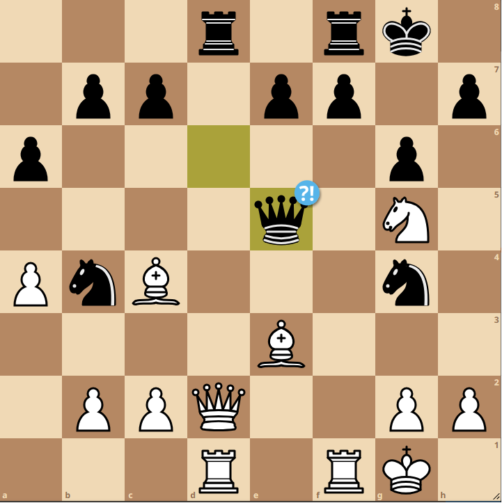 Wendt beorderte seine Dame aufs Ausgangsfeld zurück. Ein Fehler, den ich als Schwarzspielender mit dem taktischen Schlag 18. Lxg2! (mögl. Variante: Kxg2, Dg4+, Kh1, Df4 mit unausweichlicher Mattdrohung auf h2) ausnutzen konnte.