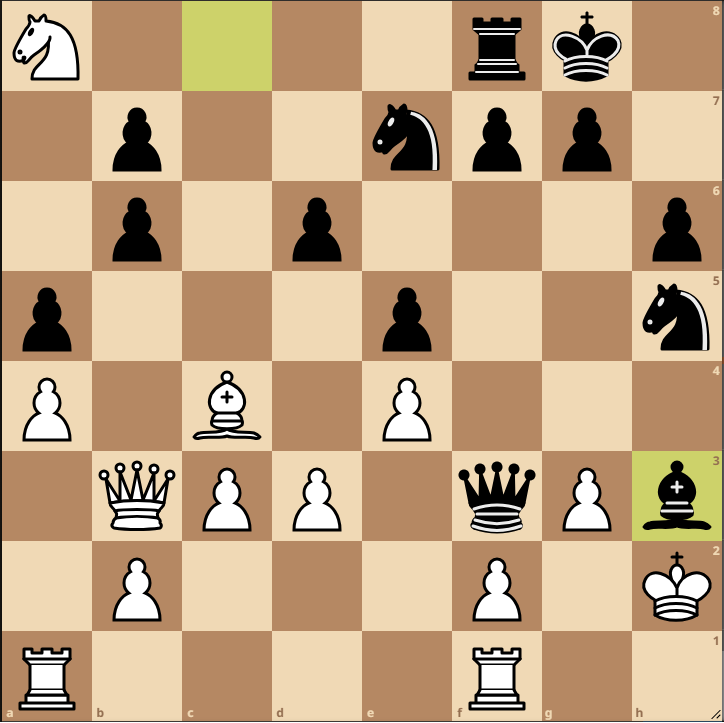 Lh4 sah spielentscheidend aus, weil der Turm verloren gehen würde. Und egal, was Weiß daraufhin gezogen hätte, Schwarz wäre mit einem Vorteil aus der Sequenz hervorgegangen. Aber – und das übersah jeder Kaponiero-Kiebitz auch bei der anschließenden Partieanalyse am Demobrett – Weiß hätte noch das trickreiche Sf5 in der Pipeline gehabt, um halbwegs das Gleichgewicht zu halten.