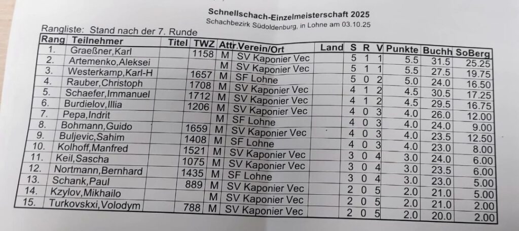 Insgesamt nahmen 15 Schachspieler an den Schnellschach-Einzelmeisterschaften des Schachbezirks Südoldenburg teil, darunter 11 Teilnehmer aus Vechta. Das Turnier war geprägt von spannenden Partien, knappen Entscheidungen und großem Kampfgeist an allen Brettern.