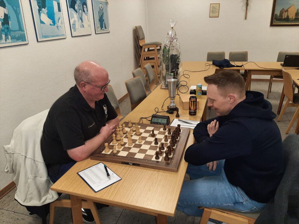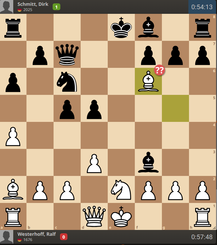 Lxf6 erwies sich als gravierender Fehler, denn Dirk konnte, anstatt den Läufer auf f6 zurückzunehmen, auf g2 zwischenschlagen. Die verbleibenden Sequenzen der Partie spielte er anschließend perfekt herunter.