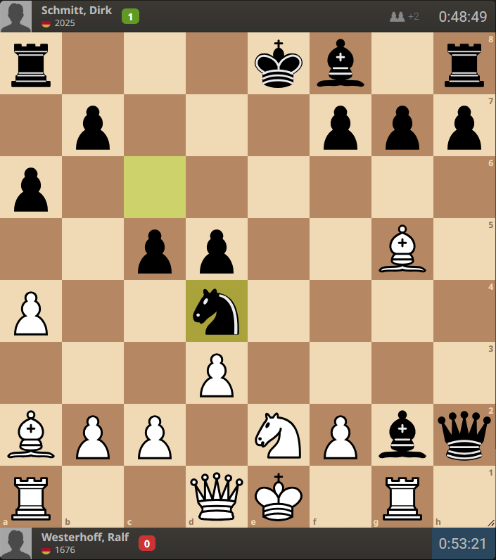 Dirk gelang es, in die weiße Stellung zu infiltrieren. Es folgten noch die Züge 14. Txg2 Dxg2 15. Sxd4 Dg1+ 16. Kd2?! Dxg5 0:1
